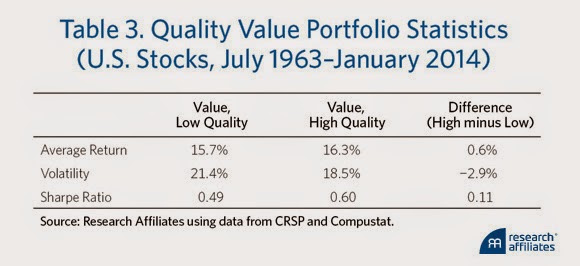 The high quality value portfolio has fewer distressed, slow growing, unprofitable companies with potentially questionable accounting practices. As a result, the high-quality value portfolio has a better risk-adjusted return. Quality is not, in itself, a factor that generates a premium; but value investing conditioned on a properly specified concept of quality is a powerful investment strategy.