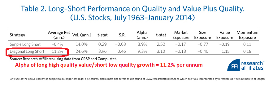 When we use quality in conjunction with value, the results are much better. The second line of Table 2 shows the results of a portfolio where we go long value stocks with high quality and short growth stocks with low quality. This long–short strategy has annual alpha of 11.2% per annum. A substantial portion of this statistically significant alpha comes from conditioning on quality information. The annualized alpha, controlling for the Fama–French–Asness–Carhart four factor model, is 9.3% per annum.