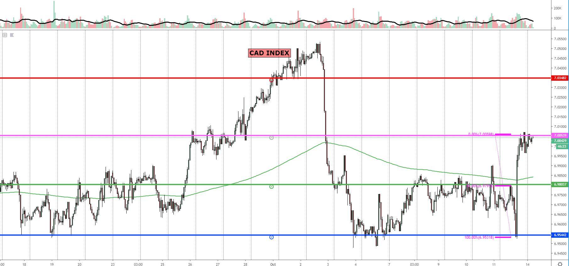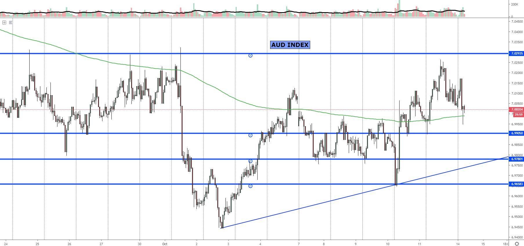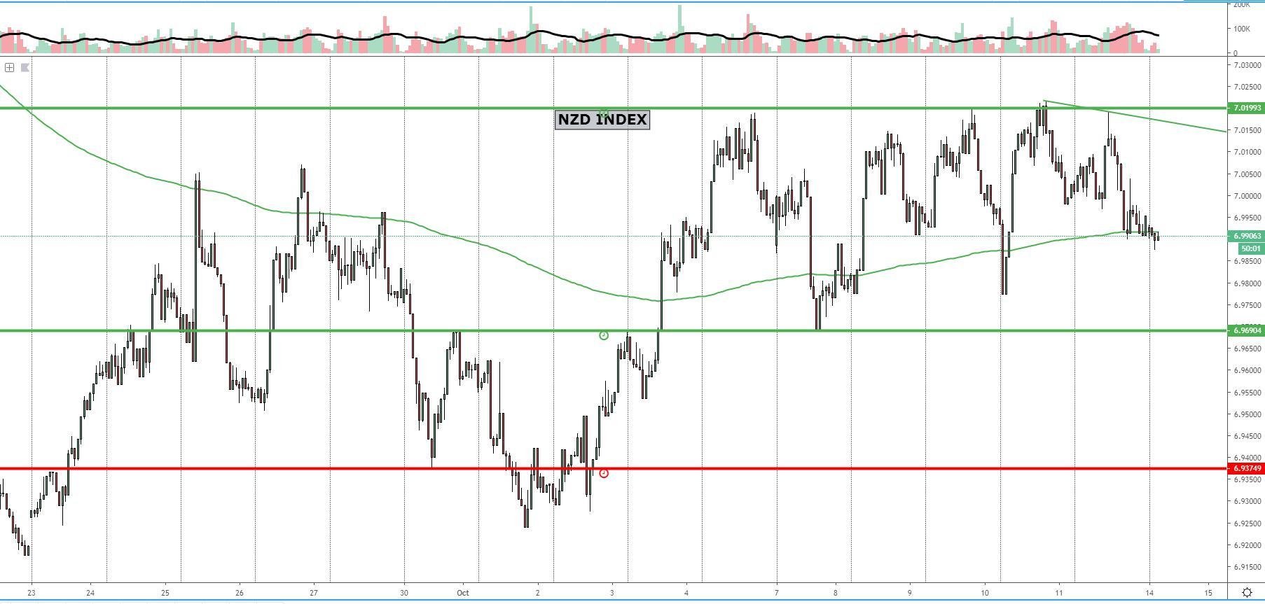 The NZD index appears to be caught in an hourly range of roughly 0.7%, with the current valuation finding a balance of bids/offers right at the mid point, which makes the zone to be trading the currency rather unattractive unless the edges are re-visited. The multitude of failed attempts to break higher has led to an eventual retracement of the index, although one would think the supply overhead is being consumed the more times it is tested. For now, the index is in no man’s land with a movement of about 0.3% in either direction to reach the cleanest areas of supply or demand where the next directional move is most likely to originate from.