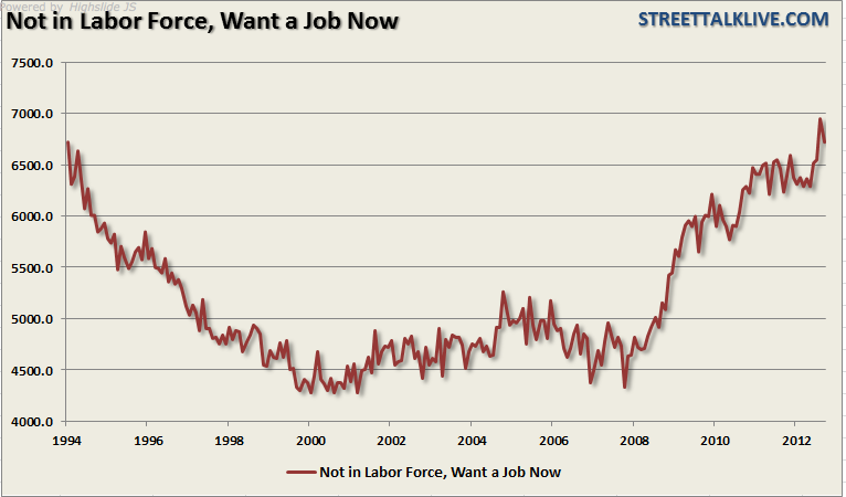 Roughly 600,000 works were wiped off the roles of the unemployed register with a simple adjustment to the calculation method. The next chart shows you the number of individuals falling into those five "discouraged worker" categories and assuming to have "given up" looking for work. As you can see, since 2009, that number has soared, which gives rise to the concern over the current method of calculation used by the BLS.