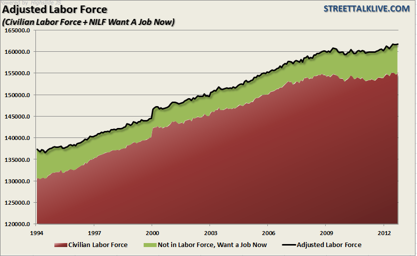 Those individuals are added back into the civilian labor force total, which comprises the adjusted labor force from which the U-3 and U-6 rates are calculated from. The chart below shows the historical adjusted labor force since 1994.