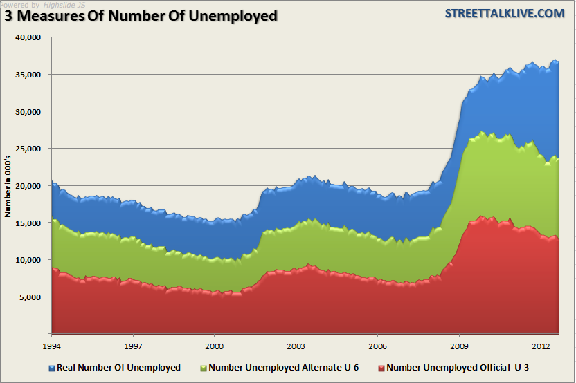 As you can see there is a large difference once adjustments are made. While the official U-3 rate of unemployment is 7.8% the less discussed alternate U-6 rate remains at 14.7%. While both of those rates have shown steady declines since the peak of last recession - the adjusted number of unemployed individuals has continued to rise and now approaches 22%.