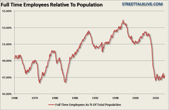 A far simpler, and more transparent, measure of employment in the U.S. is looking at the ratio of those who normally work full-time jobs to the total population. Unlike the traditional employment metrics used by the BLS, which have been adjusted to obfuscate the real employment situation -- the level of full-time employment relative to the total population accounts for the movements into, and out of, the workforce. This calculation provides a better barometer of the economic health of the country.