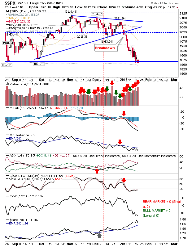 Yesterday offered the first real sign some form of capitulation kicked in. Volume was perhaps a little tame (although higher), but markets have reached a point where a short-term bounce could be in the making. What may be of greater interest is what happens once we confirm a bounce is in effect. I suspect buyers will be reluctant to push prices beyond the November/December swing lows.
