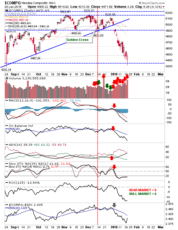 The NASDAQ tagged a low associated with the 10% band of historic weakness (although I track this metric by closing price, which wasn't reached yesterday). There was decent capitulation volume and prices defended last August lows. Given the break in the Russell 2000, it's probable the NASDAQ has to fall out of its 2015 range before a true low emerges, but a good bounce could emerge here.