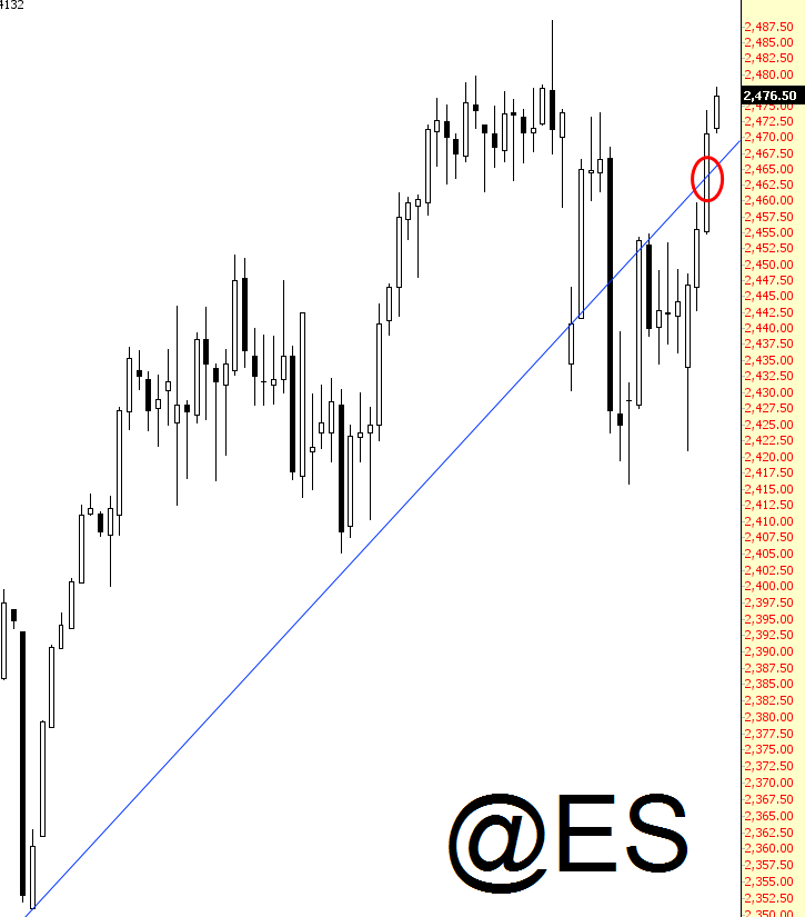 The monthly jobs report came out and although it was a little soft, equity reaction was initially fairly positive. It’s tough to say where these things wind up at the end of the day, because ultimate daily direction has little correspondence to the initial knee-jerk. As I write, the ES is up 6, having pushed cleanly above its broken trendline yesterday, circled in red (so much for THAT reversal).