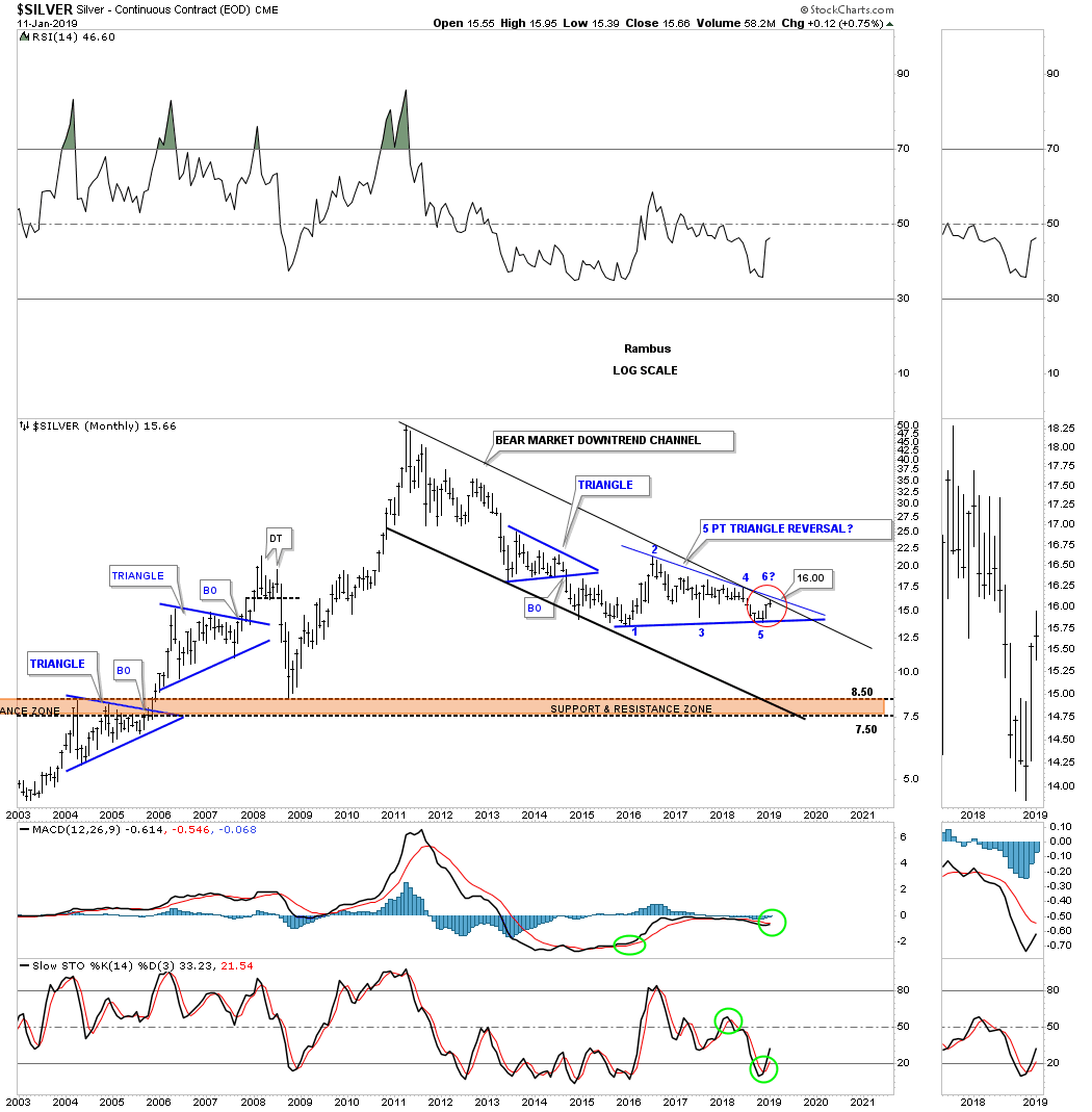 I purposely left the top rail of the 2011 downtrend channel and the top rail of the 2016 triangle thin so you can see the critical area in which silver is now trading, in the red circle. So far this month, silver has traded as high as 15.95 which puts it right against the top rail of the 2011 bear market downtrend channel and the top rail of the 2016 triangle.