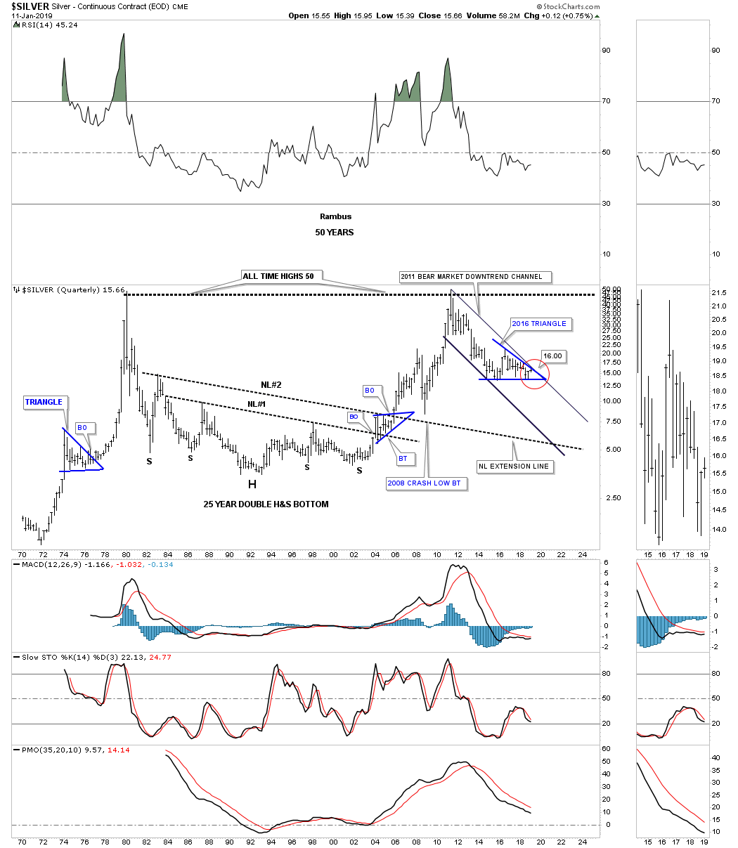 Our 2011 bear market downtrend channel doesn’t look so daunting when compared to the rest of this 50-year chart. As I mentioned earlier, when we looked at the silver monthly chart above, I was looking at the 2016 triangle to be a consolidation pattern to the downside, until the just completed 5th reversal point.