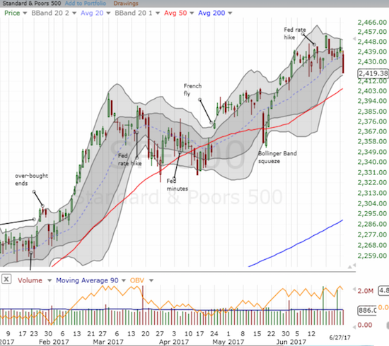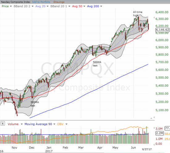 On June 9, 2017, tech stocks suddenly swooned, seemingly out of nowhere, just a day after setting another record high. Yesterday, June 27th, the NASDAQ closed at its lowest level since May 22, 2017 with a 1.6% loss on the day. The tech-laden index is also effectively retesting uptrending support at its 50-day moving average (DMA) for the first time since mid-April.