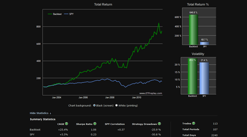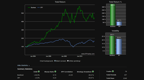 First, I tested the portfolio to 2003 using the 6 month relative performance to determine a single holding and rebalanced monthly. The results are below: