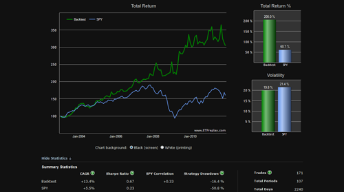 Next, if we test a strategy using the 6 month returns weighted 40%, 3 month returns weighted 30%, and 3 month volatility weighted at 30% (I refer to this as "6/3/3"), the Moose Portfolio performance is below. For more background on how this "6/3/3" strategy works, I provide background on my Internet Portfolio which I update and track monthly for free on Scott's Investments: