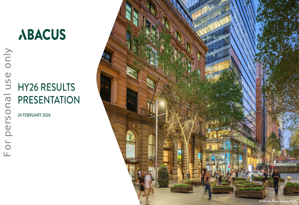 Abacus Group is a strong asset-backed, annuity style business model where capital is directed towards assets that provide potential for enhanced income growth and ultimately create value. Our people, market insight and repositioning capability together with strategic partnering are the key enablers of our strategy. Abacus Group is listed on the Australian Stock Exchange and is included in the S&P/ASX300 Index and the FTSE EPRA NAREIT Global Real Estate Index Service. The Abacus Group is a stapled entity comprising of Abacus Group Holdings Limited ACN 080 604 619, Abacus Group Projects Limited ACN 104 066 104, Abacus Trust ARSN 096 572 128, Abacus Income Trust ARSN 104 934 287.
