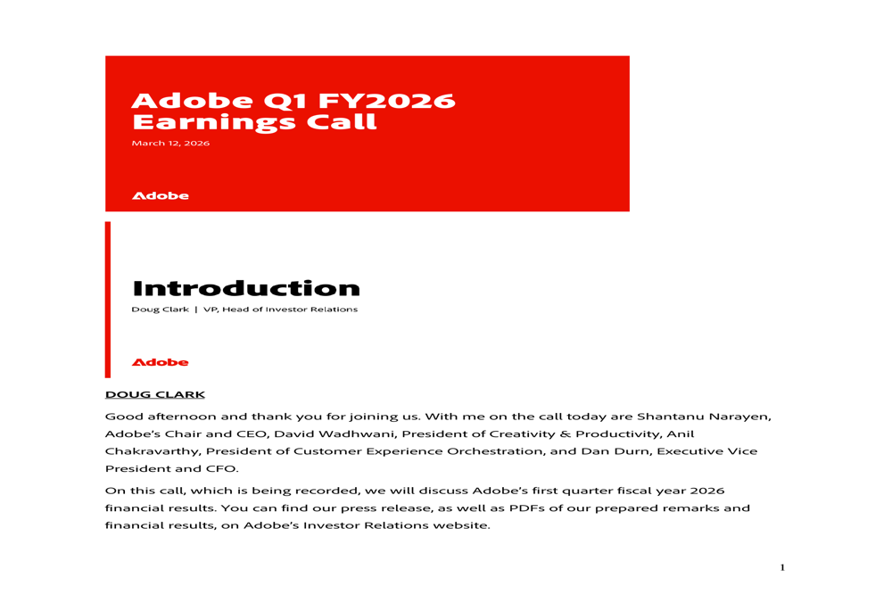 Adobe Inc. operates as a technology company worldwide. The Digital Media segment offers products and services that enable individuals, teams, and enterprises to create, publish, and promote content. This segment serves photographers, video editors, graphic and experience designers, game developers, content creators, students, marketers, business owners, knowledge workers, and consumers. The Digital Experience segment provides an integrated platform; and products, services, and solutions that enable brands and businesses to create, manage, execute, measure, monetize, and optimize customer experiences from analytics to commerce. This segment serves marketers, advertisers, agencies, publishers, merchandisers, merchants, web analysts, data scientists, developers, and executives across the C-suite. The Publishing and Advertising segment offers e-learning, technical document publishing, web conferencing, document and forms platform, web application development, printing, and Adobe Advertising solutions. It also provides consulting, training, customer management, technical support, and learning services. The company offers its solutions to enterprise customers, and businesses and consumers; and licenses its products to end-user customers through app stores and website at adobe.com. It markets and distributes its products through distributors, retailers, software developers, mobile app stores, systems integrators, independent software vendors, value-added resellers, and original equipment and hardware manufacturers. The company has a strategic alliance with HUMAIN for the development of generative AI models and AI-powered applications. The company was formerly known as Adobe Systems Incorporated and changed its name to Adobe Inc. in October 2018. Adobe Inc. was founded in 1982 and is headquartered in San Jose, California.