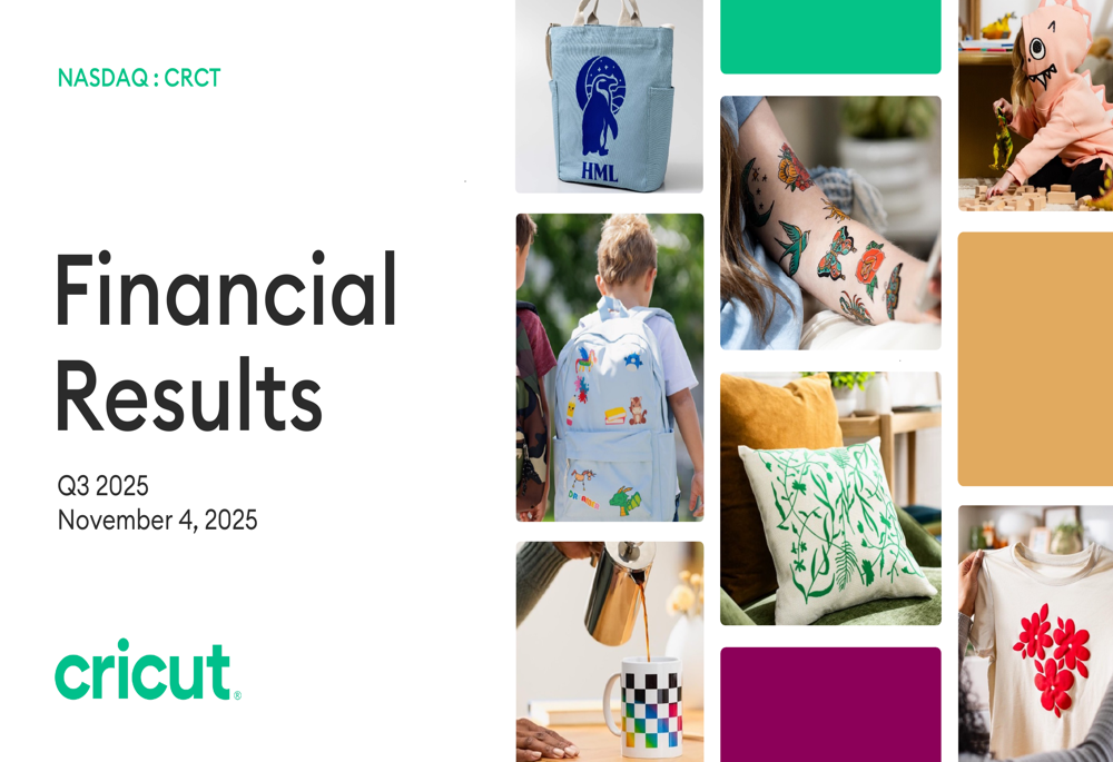 Cricut, Inc. engages in the design, marketing, and distribution of a creativity platform that enables users to turn ideas into professional-looking handmade goods in the United States, Canada, the United Kingdom, Ireland, Australia, New Zealand, Western Europe, the Middle East, Latin America, South Africa, and Asia. It operates through Platform and Products segments. The company offers connected machines, accessories, and materials for users to create personalized birthday cards, mugs, T-shirts, and large-scale interior decorations. Its connected machines, which are used to cut, write, score, and create decorative effects on paper, adhesive vinyl, iron-on vinyl, wood, and leather, comprise Cricut Joy family, Cricut Explore family, Cricut Maker family, and Cricut Venture. The company also provides Cricut Design Space, a cloud-based software that integrates with connected machines to enable users to create and work on projects across desktop and mobile devices; Cricut Access and Cricut Access Premium subscription offerings; and in-app purchases of images, fonts, and projects. In addition, it offers a range of accessories and materials, such as Cricut EasyPress, Cricut Mug Press, hand tools, machine replacement tools and blades, and project materials, such as vinyl and iron-on. Further, the company provides craft, DIY, home décor products, and extensions. It offers its products through its third-party brick-and-mortar and online retail partners; and its website cricut.com, as well as through a network of distributors. The company was formerly known as Provo Craft & Novelty, Inc. and changed its name to Cricut, Inc. in March 2018. Cricut, Inc. was incorporated in 1969 and is headquartered in South Jordan, Utah.
