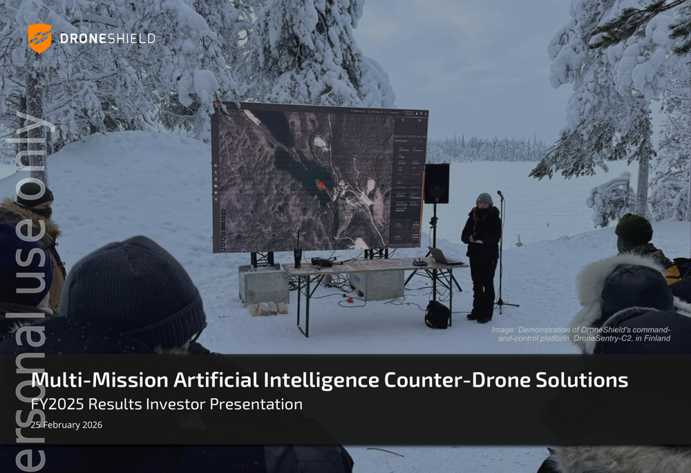 DroneShield Limited engages in the development, commercialization, and sale of counter-drone hardware and software technology in Australia, the United States, Europe, Asia, the United Kingdon, and internationally. It provides DroneSentry-C2, a command-and-control platform; DroneSentry-C2 Enterprise, a browser-based monitoring platform; DroneSentry-C2 Tactical, a rugged command-and-control solution; RfPatrol-Plugin, a mobile-first ATAK-CIV plugin; Access Portal that provides centralized access to mission-critical support and resources. The company also offers RfPatrol Mk2, a wearable solution providing true airspace awareness for military, law enforcement, and executive security personnel; DroneGun Mk4, an ultra-portable handheld countermeasure; Immediate Response Kit, a rapidly deployable counter-drone solution; and DroneGun Tactical, a portable threat long range and highly effective countermeasure. In addition, it provides DroneSentry-X Mk2, a software-defined detection and adaptive disruption system; and Expeditionary Fixed Site (EFS) Kit that transforms the DroneSentry-X Mk2 into a sensor and effector solution for wide area operations. Further, the company offers DroneSentry, an autonomous interoperable detection and countermeasure; and SentryCiv, a drone detection system that delivers 360-degree radio frequency (RF) situational awareness using its RFAI engine. It serves defence and intelligence agencies; airports, ports, prisons, data centres, and other critical infrastructure; utilities, such as power plants, electricity grids, and gas pipelines; intelligence and national security agencies; stadiums and other public event venues and organizers; and assets owners. The company sells its products through third party distributors, as well as direct relationships with various customers. DroneShield Limited was founded in 2014 and is based in Sydney, Australia.