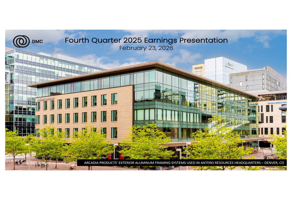 DMC Global Inc. provides various products and engineered solutions for the construction, energy, and industrial processing markets worldwide. It operates through three segments: Arcadia Products, DynaEnergetics, and NobelClad. The Arcadia Products segment offers designed, engineered, fabricated, and finished aluminum framing systems, windows, curtain walls, storefronts, entrance systems, and other architectural components for use in commercial exteriors; and interior framing and partitions comprising framing systems, aluminum doors, sliding systems, and glazing systems. This segment also provides custom, fully fabricated aluminum, steel, and wood windows and doors for the home market. This segment sells its products through a national in-house sales force for buildings, such as office towers, airports, hotels, education and athletic facilities, health care facilities, government buildings, retail centers, mixed use and multi-family residential buildings, and industrial and manufacturing centers. The DynaEnergetics segment designs, manufactures, and sells perforating systems, such as initiation systems, shaped charges, detonating cords, gun hardware, and a control panel; and perforating systems and associated hardware for the oil and gas industry. This segment sells its products through direct selling, distributors, and independent sales representatives. The NobelClad segment produces and sells explosion-welded clad metal plates for use in the construction of heavy, corrosion resistant pressure vessels, and heat exchangers for oil and gas, chemical and petrochemical, petroleum refining, alternative energy, hydrometallurgy, aluminum production, shipbuilding, power generation, and industrial refrigeration industries. The company was formerly known as Dynamic Materials Corporation and changed its name to DMC Global Inc. in November 2016. DMC Global Inc. was founded in 1965 and is headquartered in Broomfield, Colorado.
