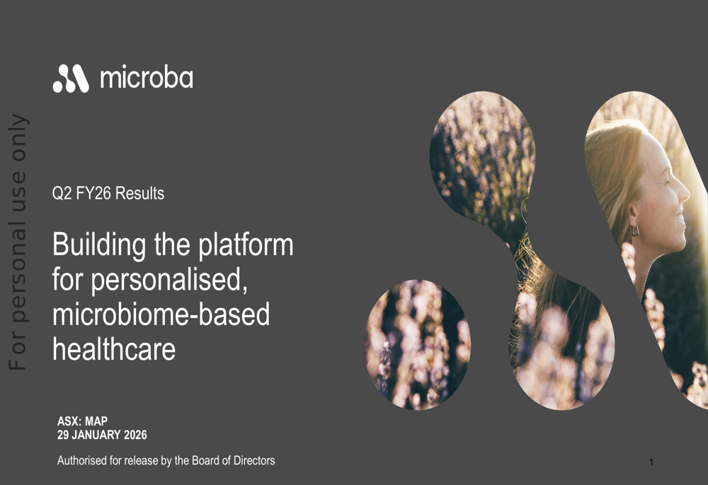 Microba Life Sciences Limited provides microbiome testing, supplements, and analysis services in Australia, Europe, New Zealand, the United Arab Emirates, the United Kingdom, the United States, Asia, and Ireland. It operates in two segments, Testing Services and Supplements, and Research and Development. The company also develops pathology, therapeutics, and diagnostics services based on the human gut microbiome. In addition, it offers MetaPanel, a metagenomic test for pathogen detection; MetaXplore that provides a range of diagnostics solution under the Co-Biome brand; research testing services; and data-driven therapeutics platform that develops therapies for ulcerative colitis, and inflammatory bowel and autoimmune diseases, as well as microbiome databank. Microba Life Sciences Limited was incorporated in 2017 and is based in Brisbane, Australia.
