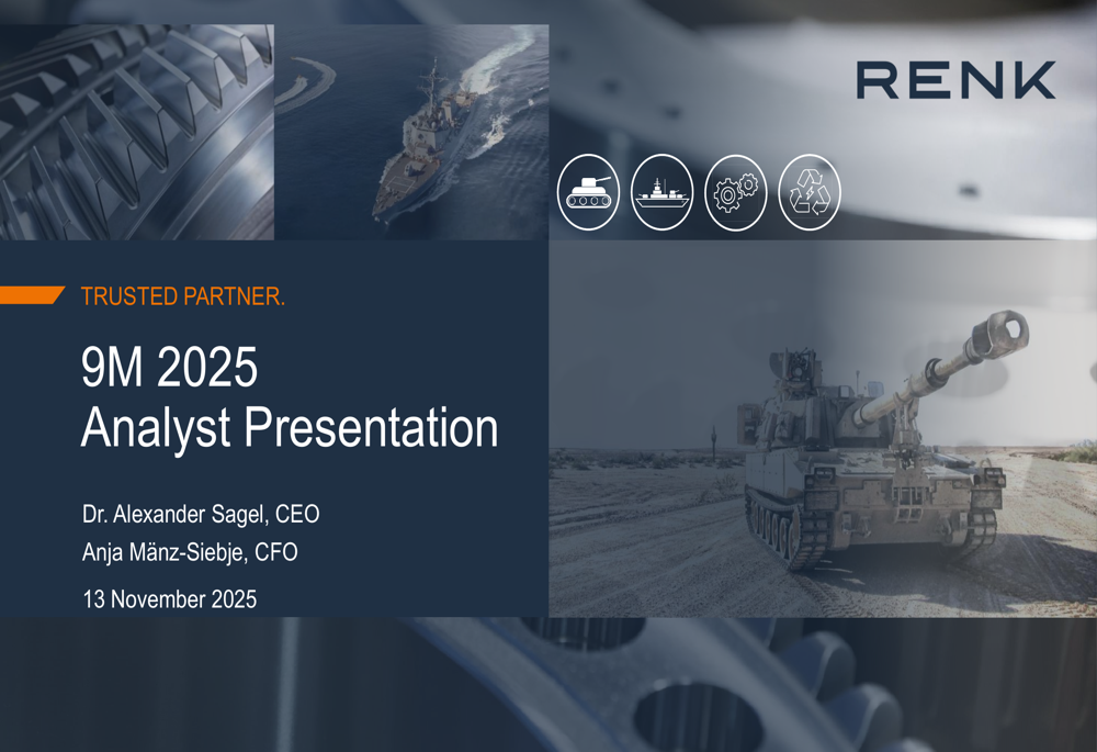 RENK Group AG engages in the design, engineering, production, testing, and servicing of customized drive systems in Germany and internationally. The company operates through three segments: Vehicle Mobility Solutions, Marine & Industry, and Slide Bearings. It offers single and dual engine gearboxes; marine gearboxes, clutches, and bearings; shaft generators; hybrid and electric, and onboard power grid solutions; transmissions, engines, final drives, suspension systems, and track tension; and electrification and hybrid mobility solutions. The company also provides helical, planetary, integral, vacuum, and clutch gearboxes; variable speed systems; and industrial gearboxes for mills, extruders, and hydropower plants. In addition, it offers slide bearings, couplings, and test systems. The company also provides engineering, condition monitoring, maintenance and modernization, and spare parts management services; mechanical and gear manufacturing, hardening, and metrology services; marine services, including evaluation and design of propulsion system, and power distribution and grid design; design of suspension for military vehicle; and test systems. The company serves military vehicles, marine and civil marine, cement and plastics production, and oil and gas industries, as well as customers in hydrogen, energy generation, carbon capture, utilization and storage, and industrial heat pump applications. RENK Group AG was founded in 1873 and is headquartered in Augsburg, Germany