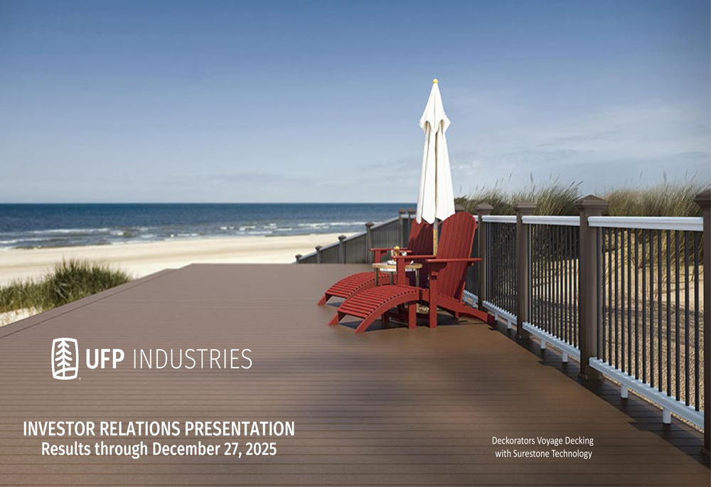 UFP Industries, Inc., together with its subsidiaries, designs, manufactures, and supplies wood and non-wood composites, and other materials in the United States and internationally. It operates through three segments: Retail, Construction, and Packaging. The Retail segment offers pressure-treated and fire-retardant products under the ProWood brand; lawn and garden products, such as wood and vinyl fencing and lattice, garden beds and planters, pergolas, picnic tables, and other landscaping products under the Outdoor Essentials brand; wood plastic composite; mineral based composite decking and related decking accessories, including aluminum railing systems, balusters, and post caps under the Surestone brand; customized and aluminum fencing; exterior siding, pattern, trim, and fascia products; and pre-painted and primed shiplap, and project boards. The Packaging segment designs, engineers, manufactures, and tests custom packaging products made of wood and metal; designs and manufactures pallets made of wood and heat-treated wood; and provides corrugate, foam, labels, strapping, and films. The Construction segment designs and manufactures roof trusses, cut-to-size dimensional and board lumber, plywood, and oriented strand board; designs and manufactures roof and floor trusses, wall panels, I-joists, lumber packages, and engineered wood components used to frame residential and light commercial projects. This segment also engages in the designing, manufacturing, and installing of customized interior fixtures, casework, and architectural millwork used in retail and commercial structures; designs, manufactures, and supplies wood forms and related products for residential building, non-residential building, distribution, and infrastructure verticals. The company was formerly known as Universal Forest Products, Inc. and changed its name to UFP Industries, Inc. in April 2020. UFP Industries, Inc. was incorporated in 1955 and is headquartered in Grand Rapids, Michigan.
