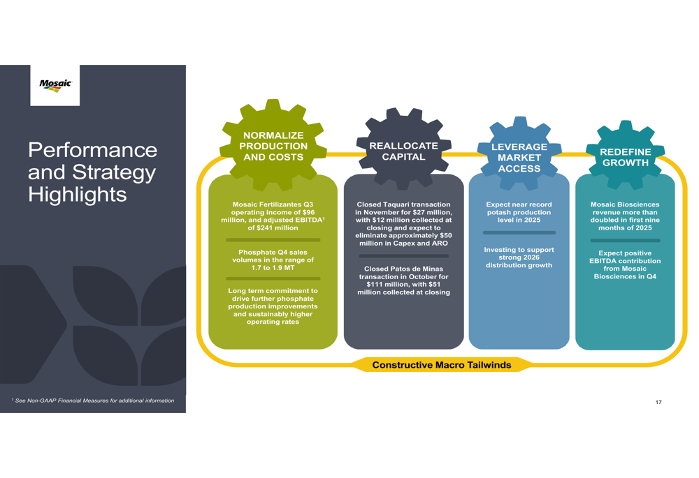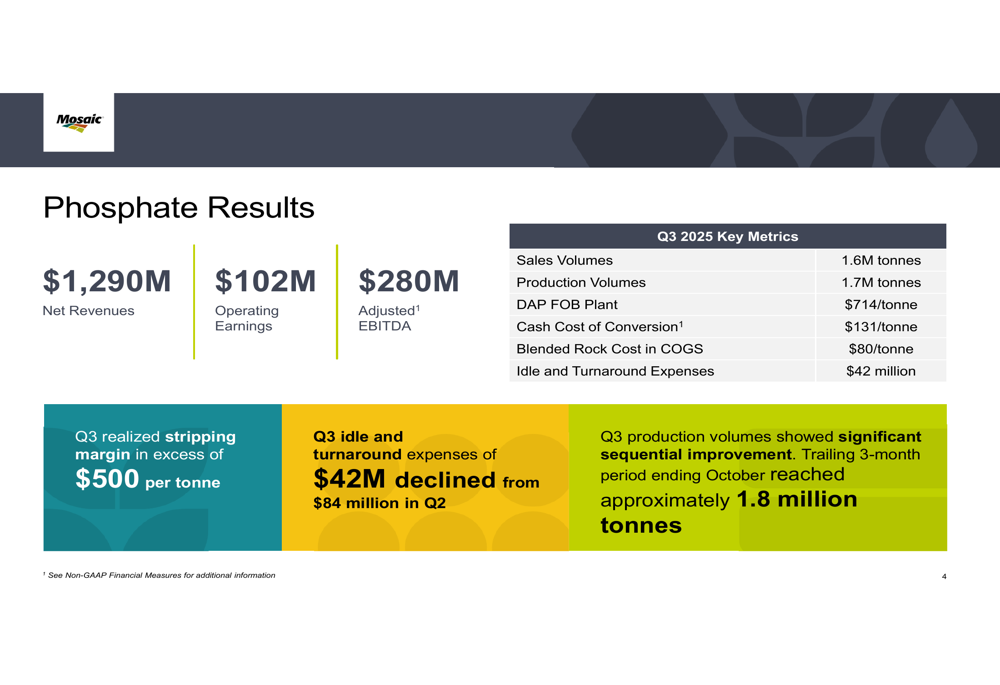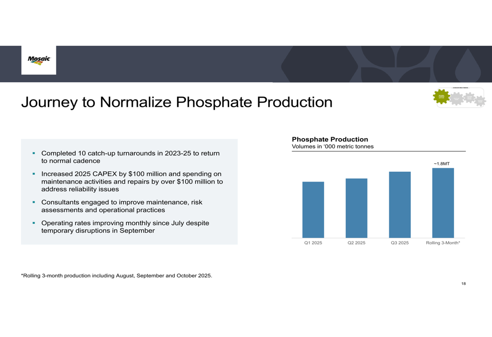 A key driver of Mosaic’s improved performance has been the company’s focus on normalizing production and reducing costs. After completing ten catch-up turnarounds between 2023-2025, phosphate production has been steadily improving, with the trailing three-month period ending October reaching approximately 1.8 million tonnes.