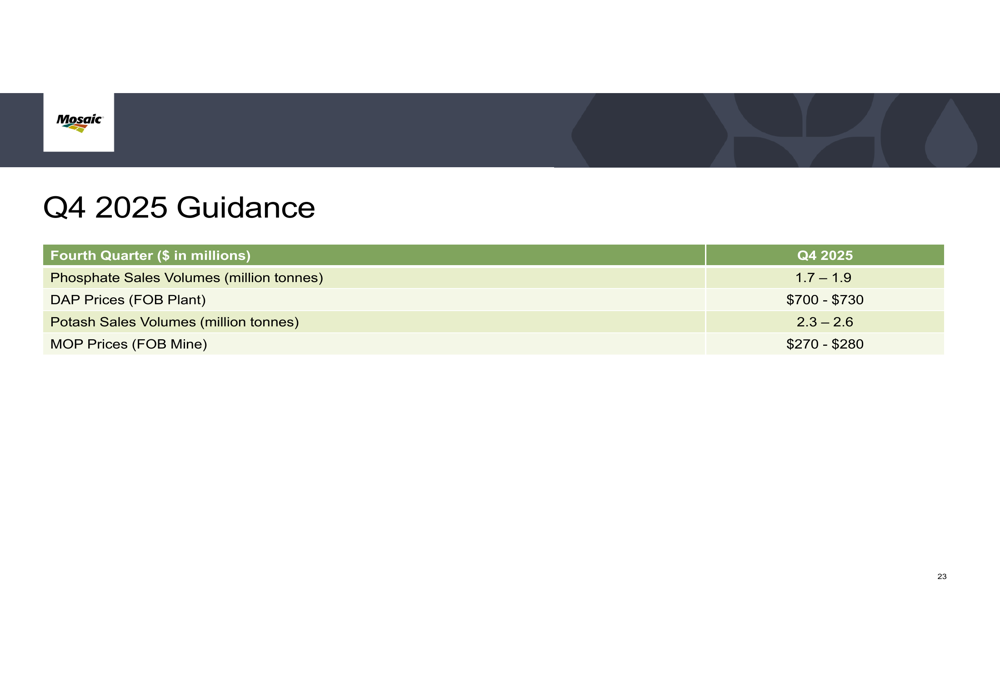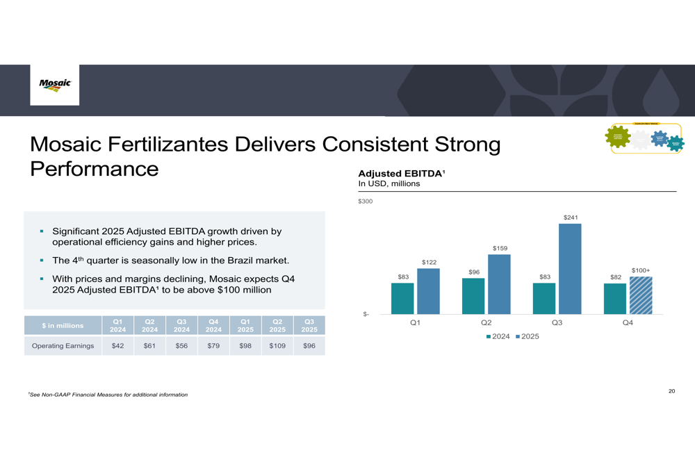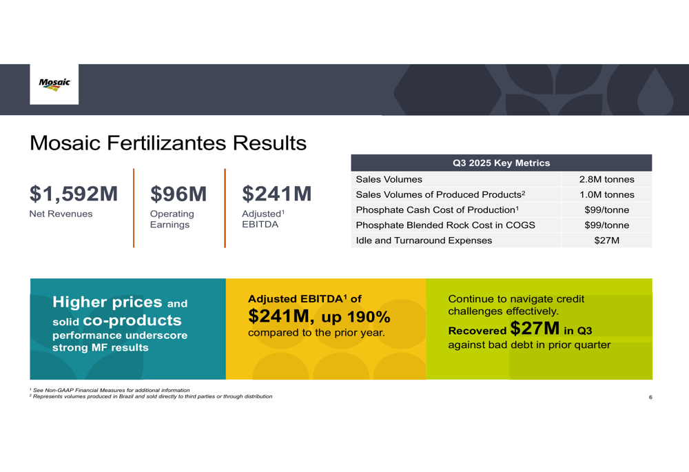 Mosaic Fertilizantes has delivered consistent strong performance throughout 2025, with significant adjusted EBITDA growth driven by operational efficiency gains and higher prices. The segment recovered $27 million in Q3 against bad debt from the prior quarter.