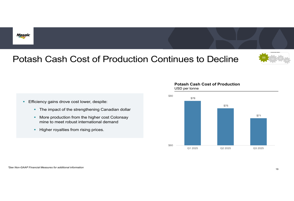 In the Potash segment, efficiency gains have driven production costs lower despite the impact of a strengthening Canadian dollar and higher royalties from rising prices. Cash cost of production decreased from $78 per tonne in Q1 2025 to $71 per tonne in Q3 2025.