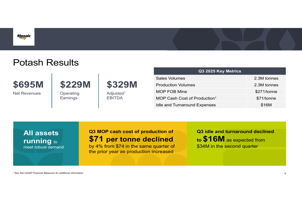 Mosaic’s Potash segment delivered net revenues of $695 million and adjusted EBITDA of $329 million. The segment reported sales and production volumes of 2.3 million tonnes each, with an MOP FOB mine price of $271 per tonne.