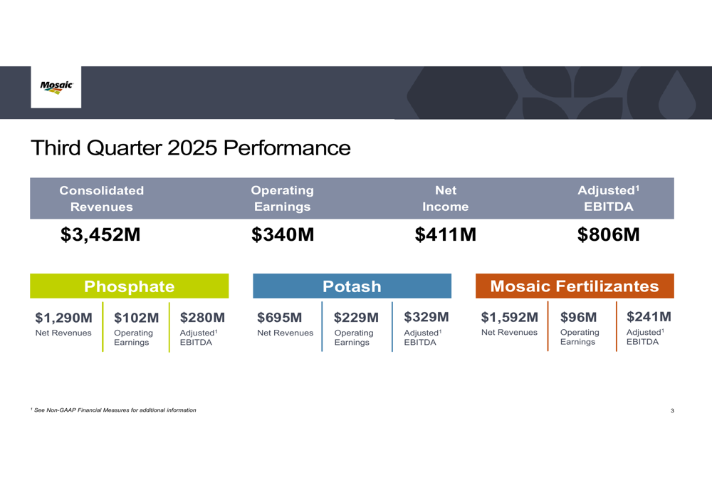 Mosaic delivered consolidated revenues of $3.45 billion in Q3 2025, with operating earnings of $340 million and net income of $411 million—more than tripling from $122 million in the same period last year. Adjusted EBITDA reached $806 million, up 80% from $448 million in Q3 2024.