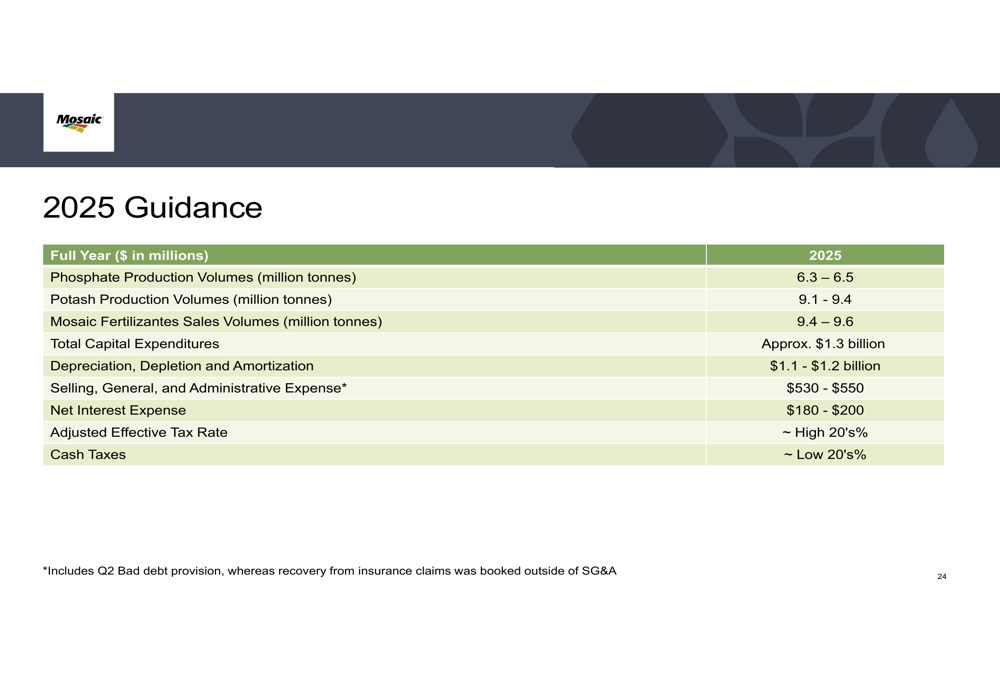 For the full year 2025, Mosaic projects phosphate production volumes of 6.3-6.5 million tonnes and potash production volumes of 9.1-9.4 million tonnes. Total capital expenditures are expected to be approximately $1.3 billion.