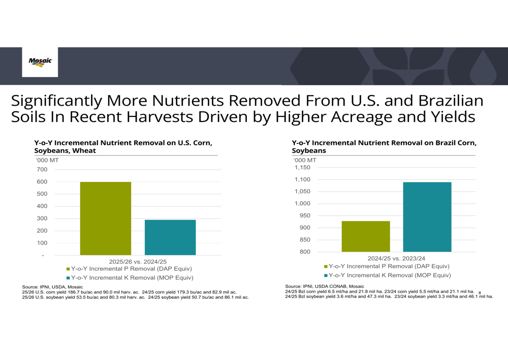 Strong global demand fundamentals are supporting Mosaic’s positive outlook. In both the U.S. and Brazil, significantly more nutrients are being removed from soils due to higher acreage and yields, driving fertilizer demand.