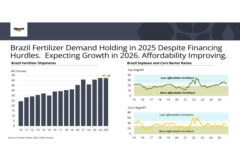 Brazil’s fertilizer demand remains robust, with shipments estimated at 47-48 million tonnes in 2025. The affordability of fertilizers for Brazilian farmers has improved, as illustrated by favorable barter ratios for both soybeans and corn.